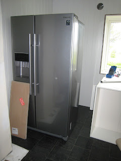 Det nye kjøleskapet er også kommet opp, men ingen vann på det enda, mangler hull i gulvet sånn at vann kan kobles.